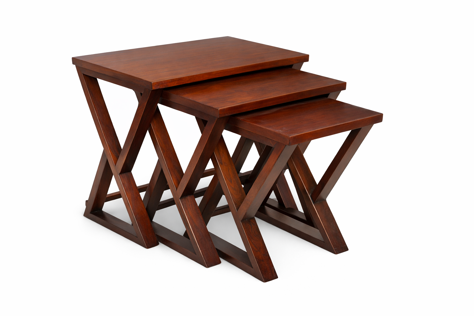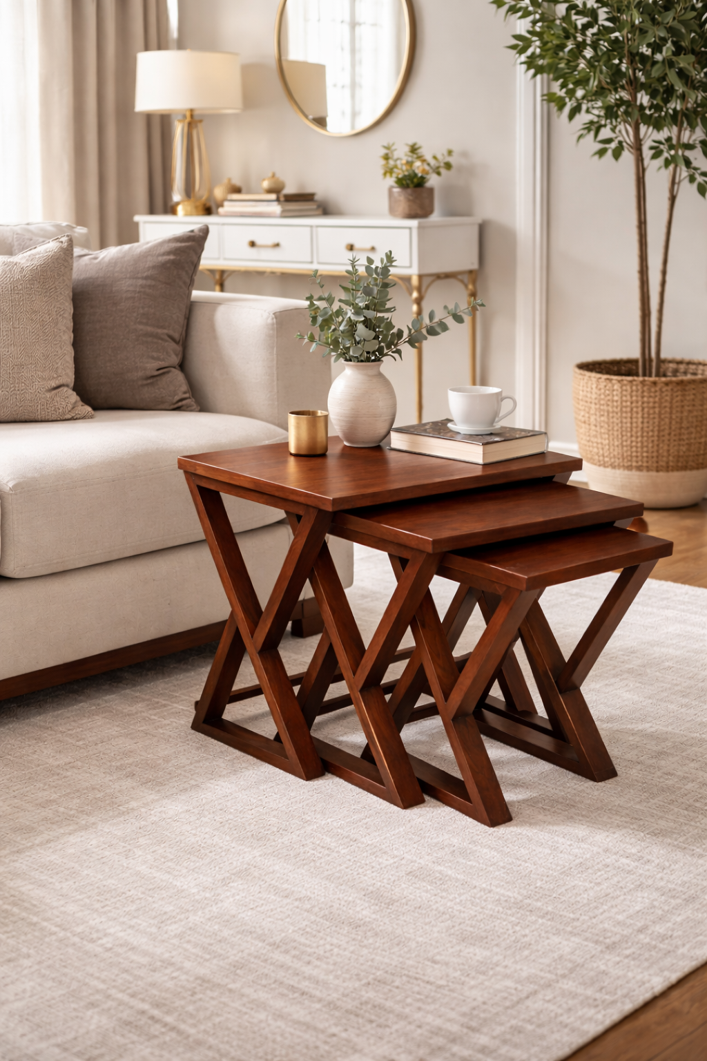 Elevate your living space with this thoughtfully designed set of three nesting tables — where practicality meets refined style. Crafted in a rich walnut finish, the clean rectangular tops rest on bold X-shaped legs, adding architectural character while ensuring strong structural stability.